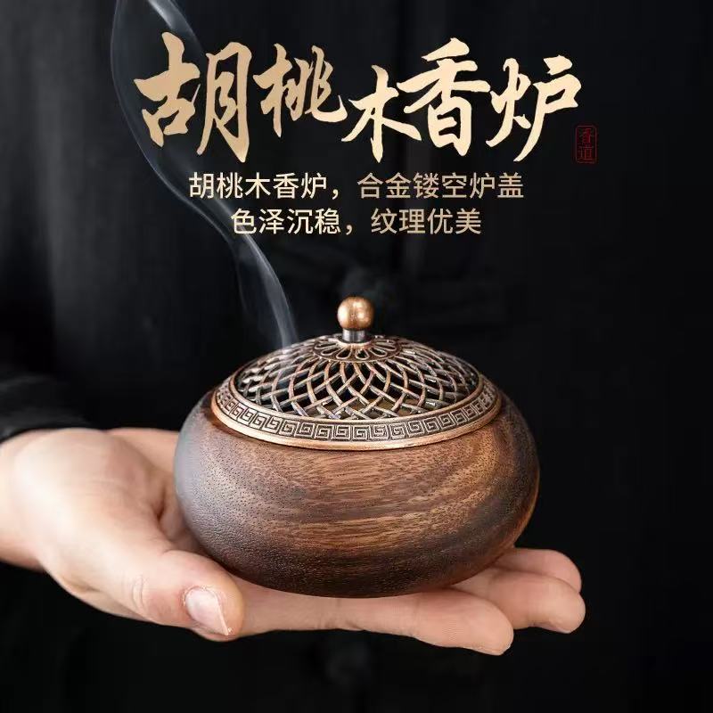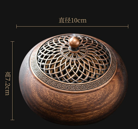 Encensoir en bois massif de noyer, creusé dans un seul bloc, avec couvercle ajouré en alliage aux motifs élégants et sobres.